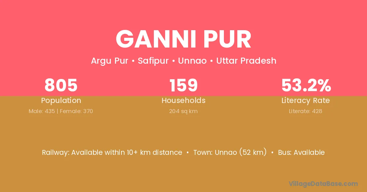 Unnao (52 km) is the nearest town to Ganni Pur village for major economic activities and is located approximately 52 km away.