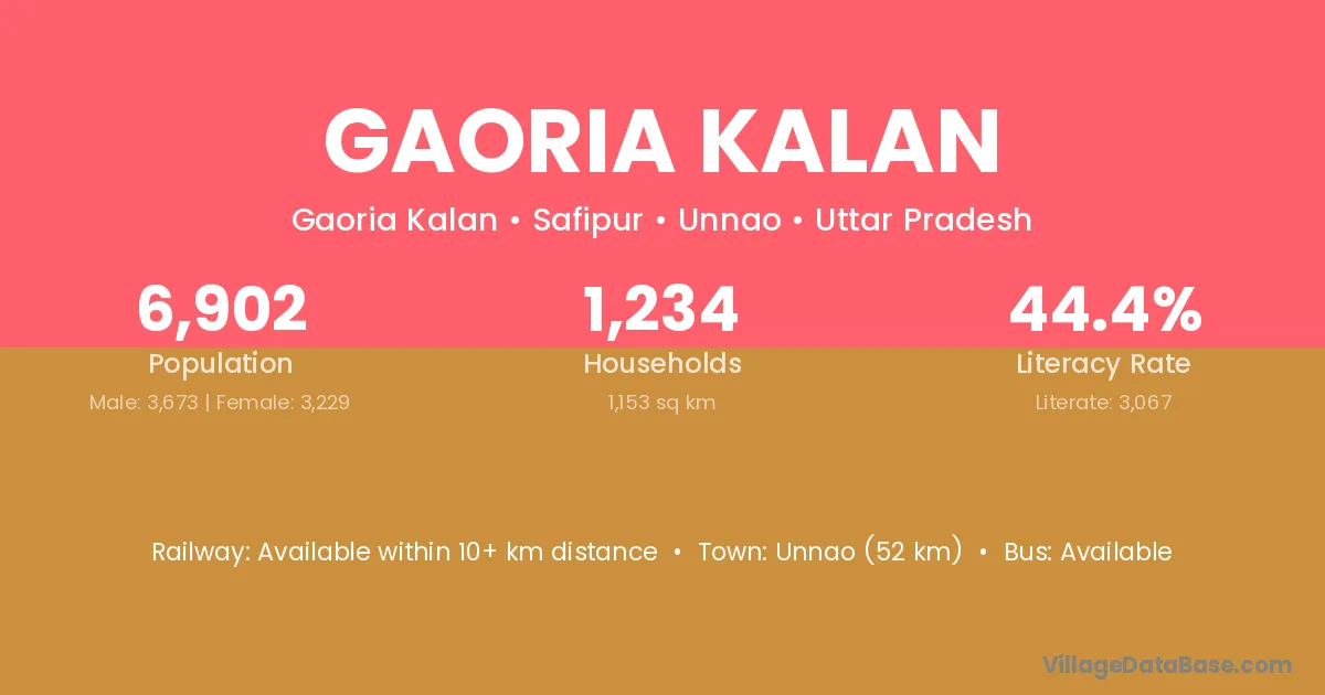Unnao (52 km) is the nearest town to Gaoria Kalan village for major economic activities and is located approximately 52 km away.