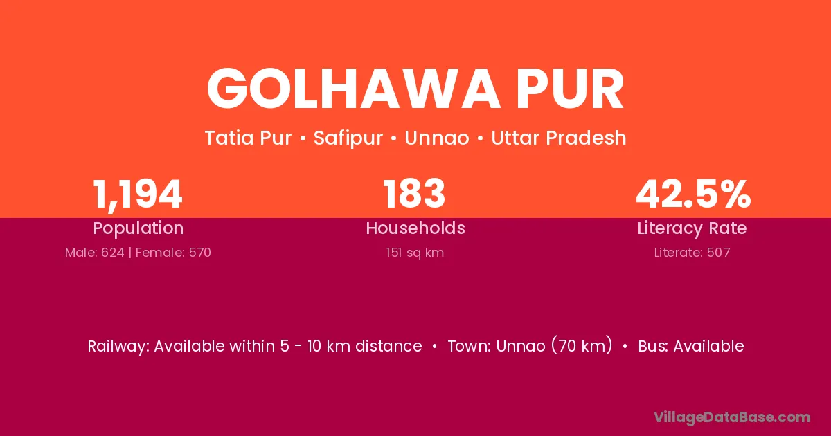 Unnao (70 km) is the nearest town to Golhawa Pur village for major economic activities and is located approximately 70 km away.