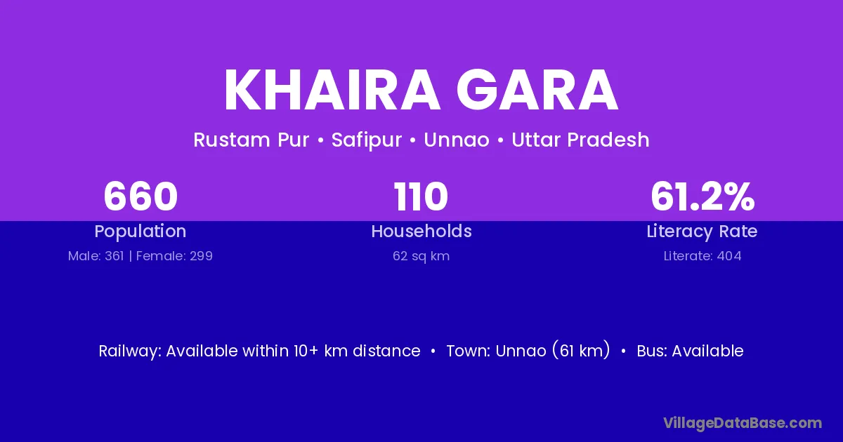 Unnao (61 km) is the nearest town to Khaira Gara village for major economic activities and is located approximately 61 km away.