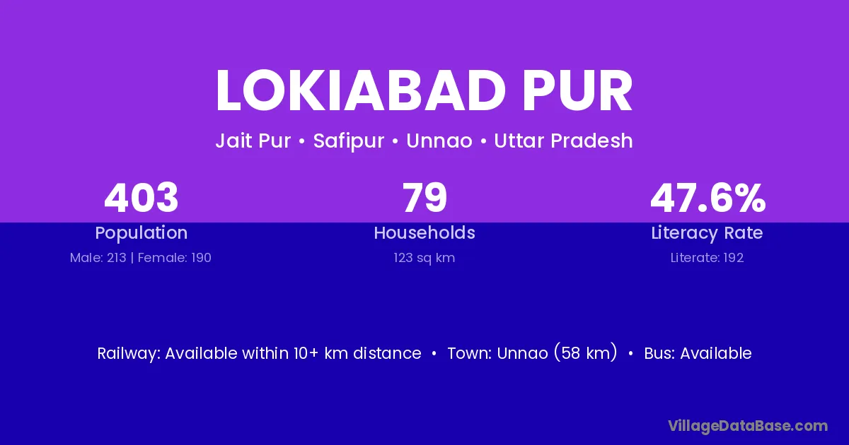 Unnao (58 km) is the nearest town to Lokiabad Pur village for major economic activities and is located approximately 58 km away.