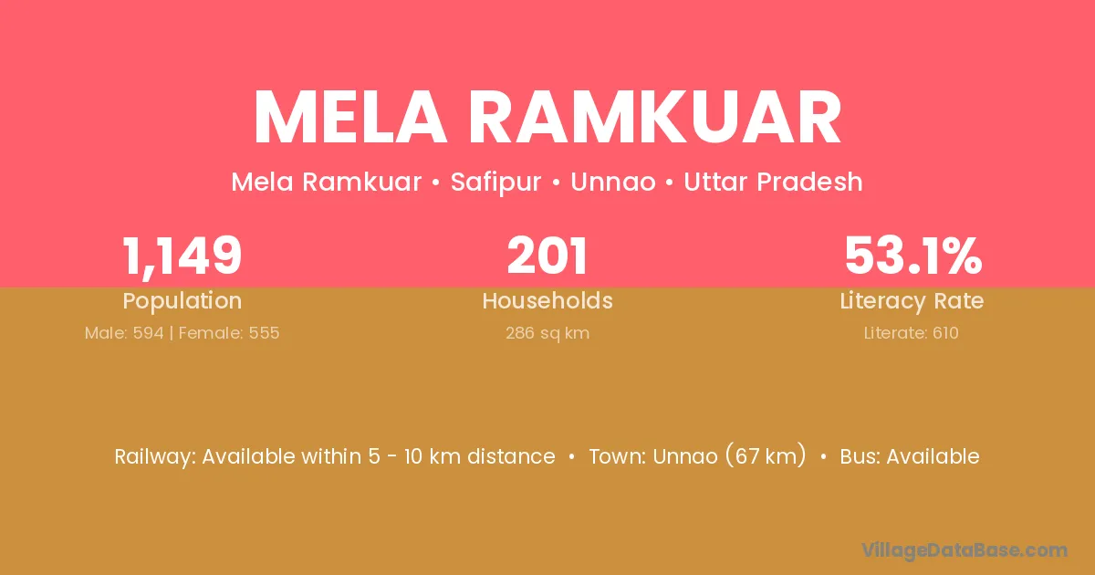 Unnao (67 km) is the nearest town to Mela Ramkuar village for major economic activities and is located approximately 67 km away.