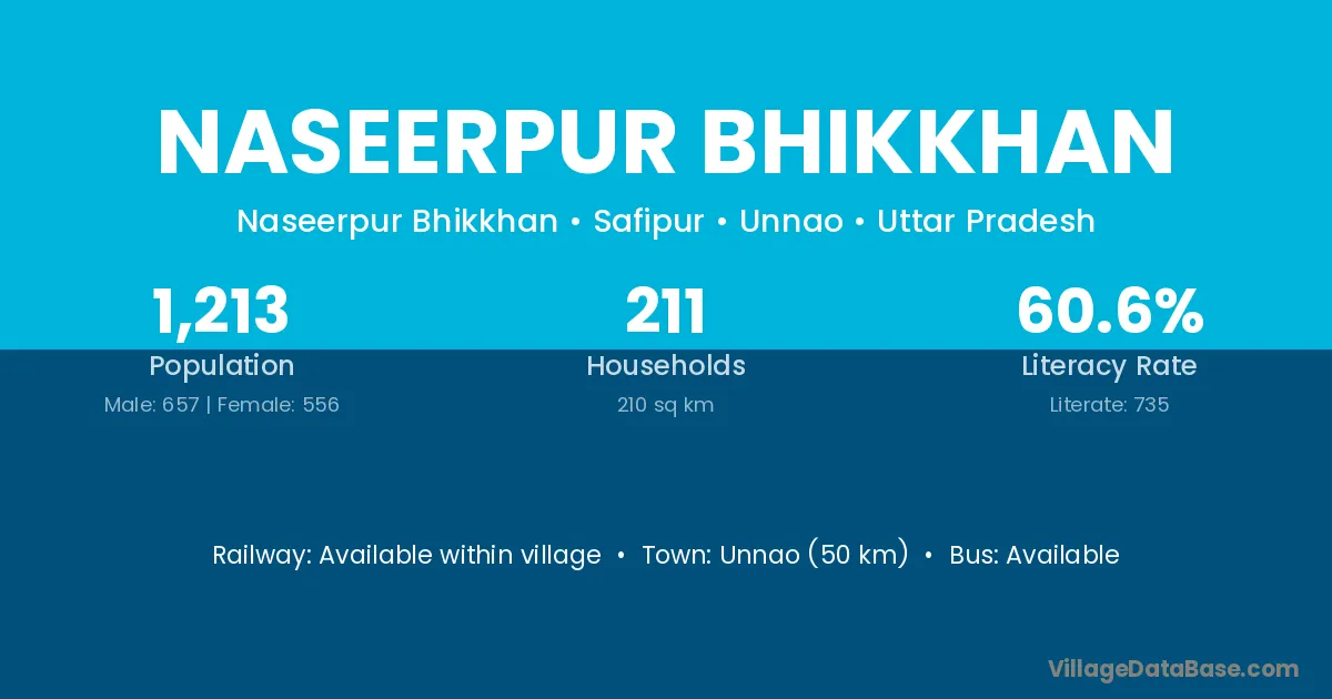 Unnao (50 km) is the nearest town to Naseerpur Bhikkhan village for major economic activities and is located approximately 50 km away.