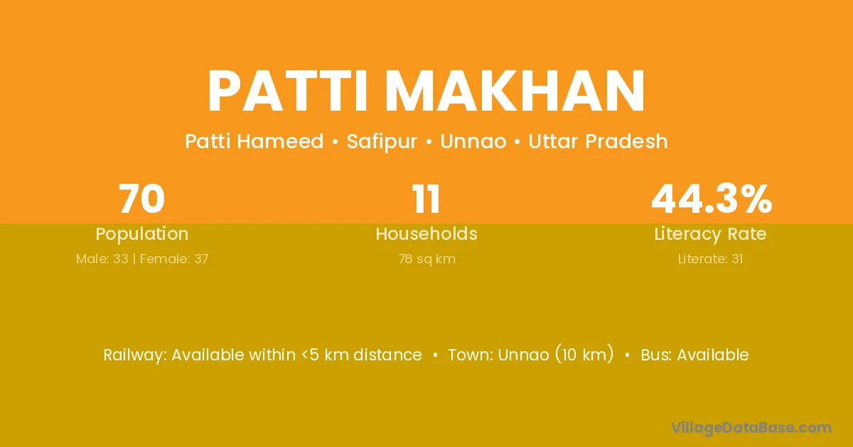 Unnao (10 km) is the nearest town to Patti Makhan village for major economic activities and is located approximately 10 km away.