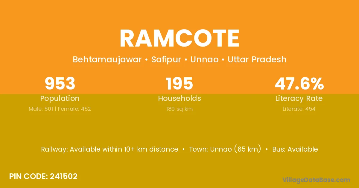 Unnao (65 km) is the nearest town to Ramcote village for major economic activities and is located approximately 65 km away.