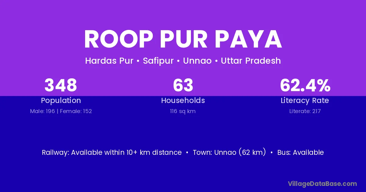 Unnao (62 km) is the nearest town to Roop Pur Paya village for major economic activities and is located approximately 62 km away.