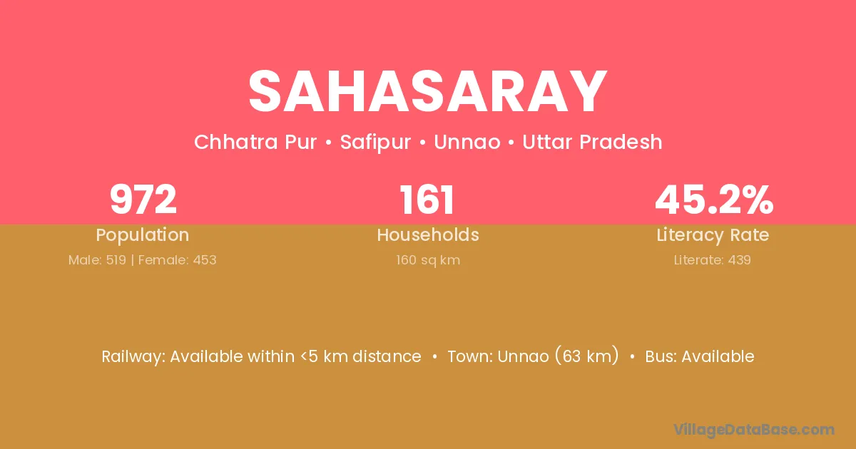 Unnao (63 km) is the nearest town to Sahasaray village for major economic activities and is located approximately 63 km away.