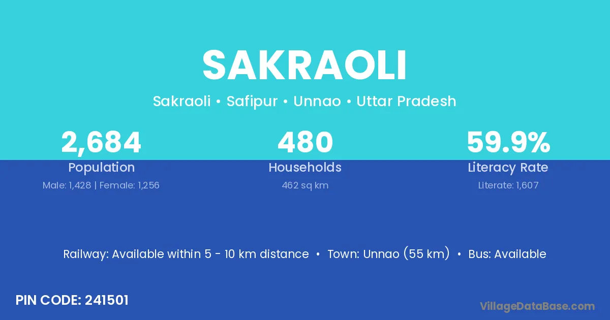 Unnao (55 km) is the nearest town to Sakraoli village for major economic activities and is located approximately 55 km away.