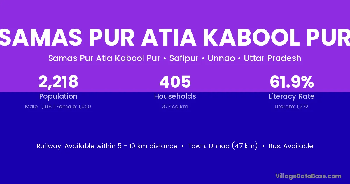 Samas Pur Atia Kabool Pur village has a total population of 2,218 people, of which 1,198 are males and 1,020 are females.