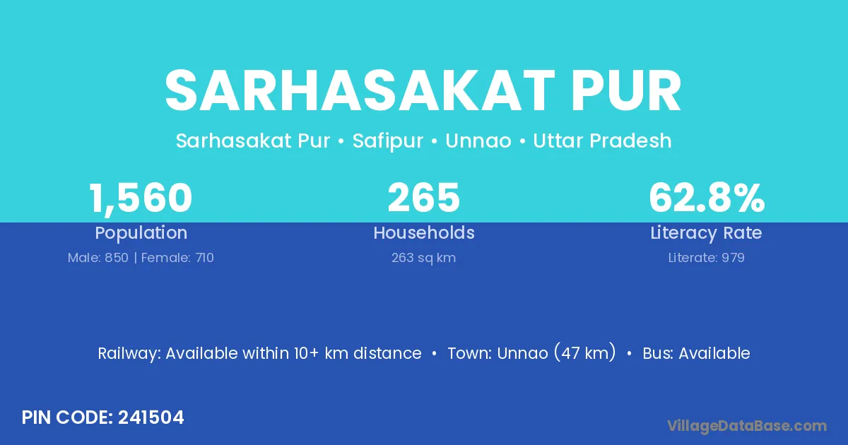 Unnao (47 km) is the nearest town to Sarhasakat Pur village for major economic activities and is located approximately 47 km away.