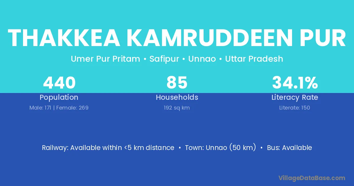 Unnao (50 km) is the nearest town to Thakkea Kamruddeen Pur village for major economic activities and is located approximately 50 km away.