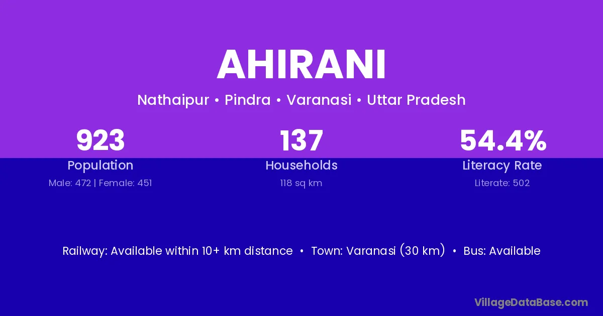 Varanasi (30 km) is the nearest town to Ahirani village for major economic activities and is located approximately 30 km away.