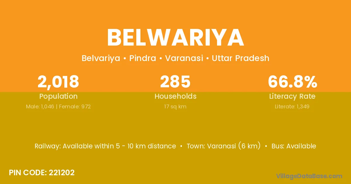 Varanasi (6 km) is the nearest town to Belwariya village for major economic activities and is located approximately 6 km away.