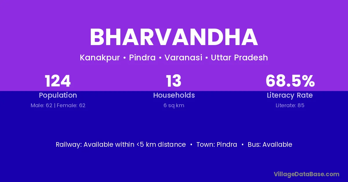 Bharvandha village has a total population of 124 people, of which 62 are males and 62 are females.