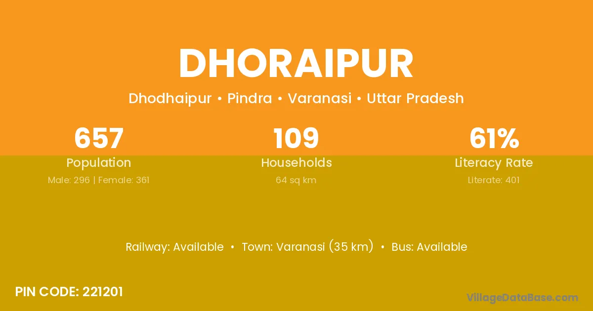 Varanasi (35 km) is the nearest town to Dhoraipur village for major economic activities and is located approximately 35 km away.