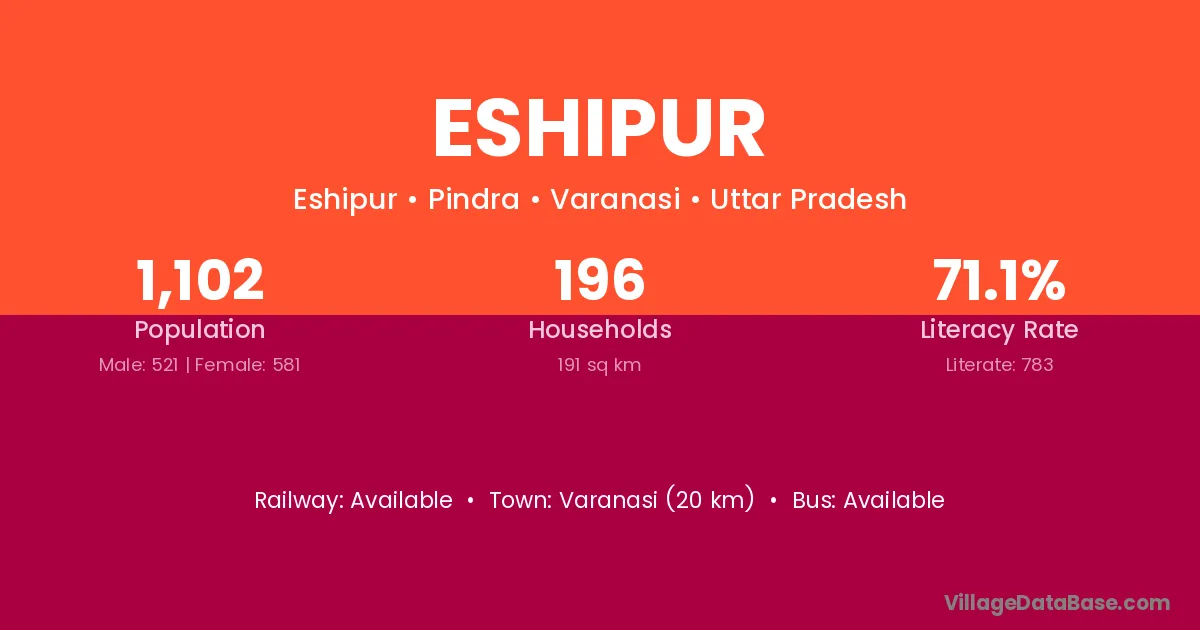 Varanasi (20 km) is the nearest town to Eshipur village for major economic activities and is located approximately 20 km away.