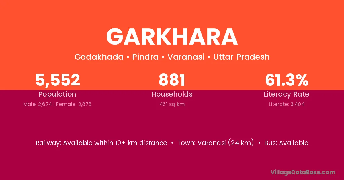 Varanasi (24 km) is the nearest town to Garkhara village for major economic activities and is located approximately 24 km away.