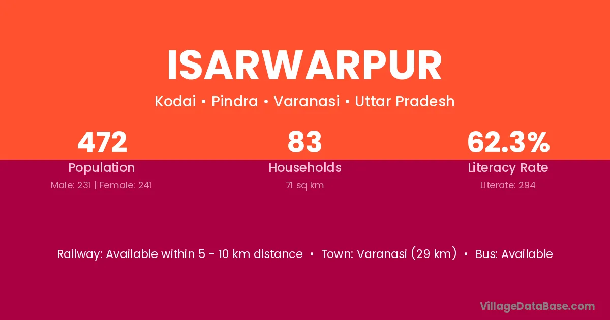 Isarwarpur village has a total population of 472 people, of which 231 are males and 241 are females.