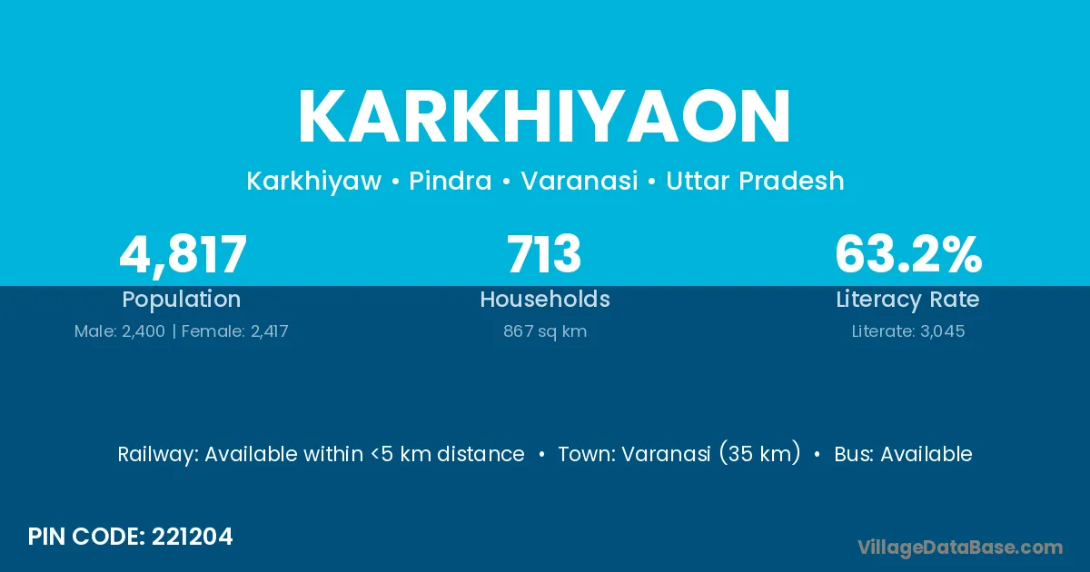 Varanasi (35 km) is the nearest town to Karkhiyaon village for major economic activities and is located approximately 35 km away.