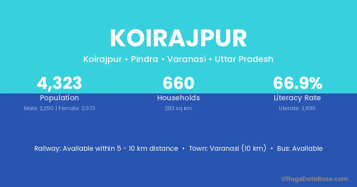 Varanasi (10 km) is the nearest town to Koirajpur village for major economic activities and is located approximately 10 km away.