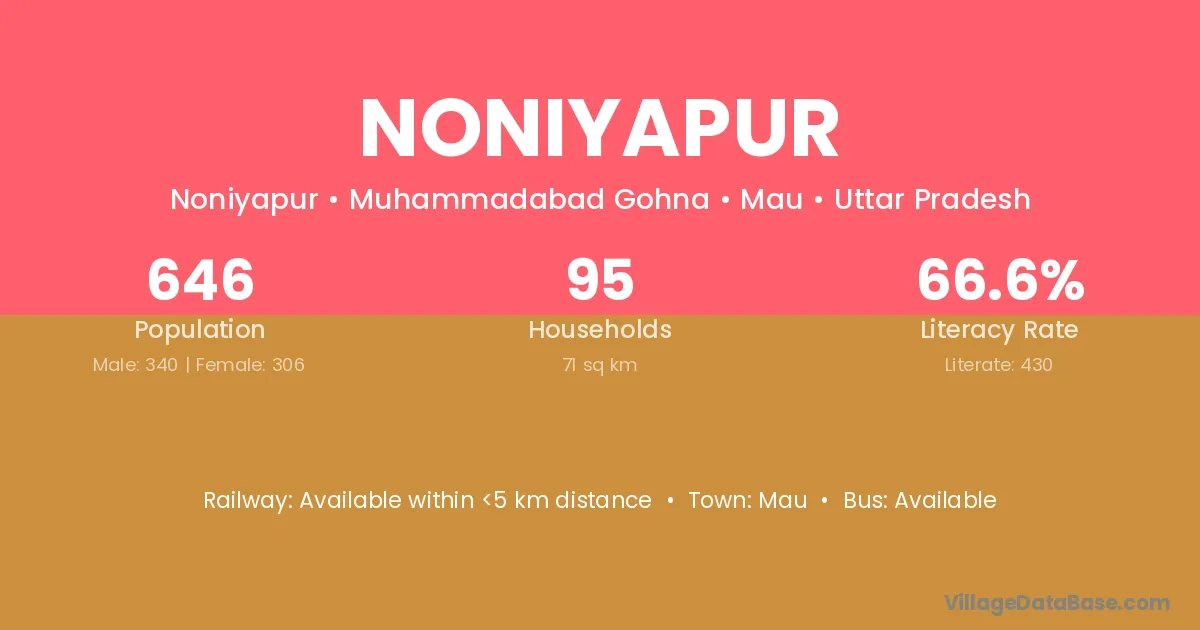 The literacy rate of Noniyapur village is 60.74%. Male literacy stands at 70.62% and female literacy at 51.35%.