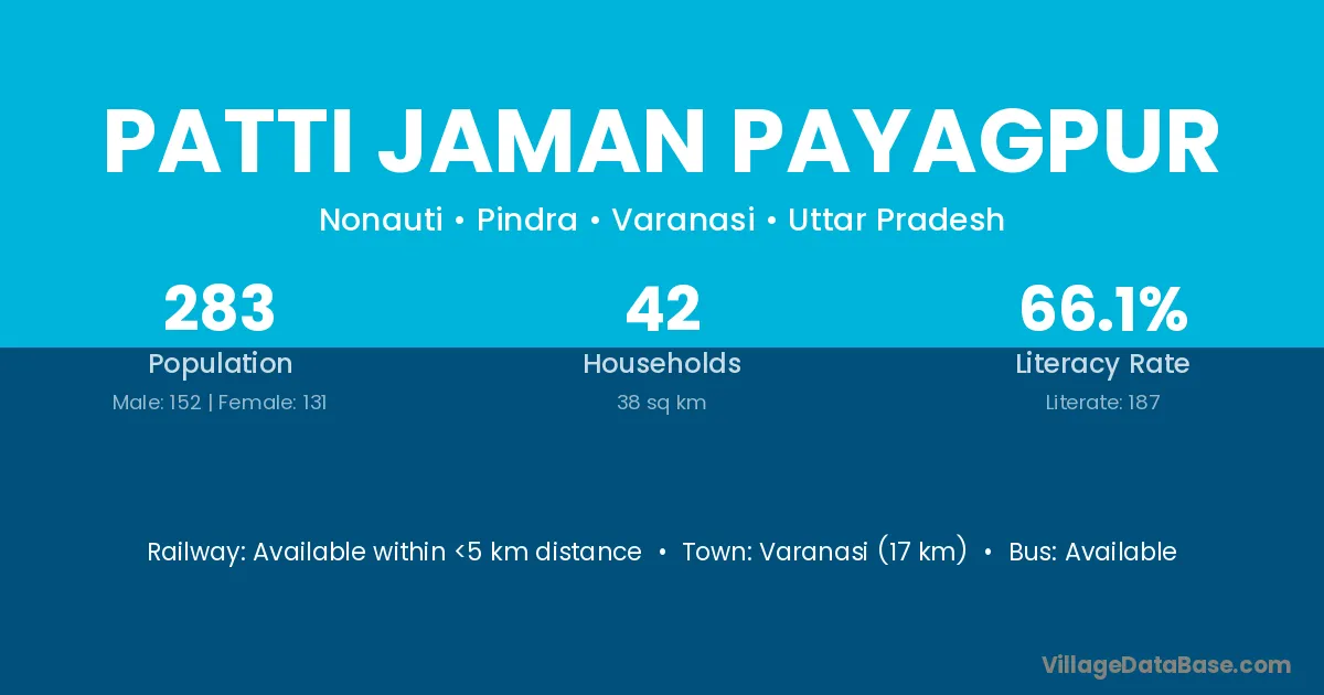 Varanasi (17 km) is the nearest town to Patti Jaman Payagpur village for major economic activities and is located approximately 17 km away.
