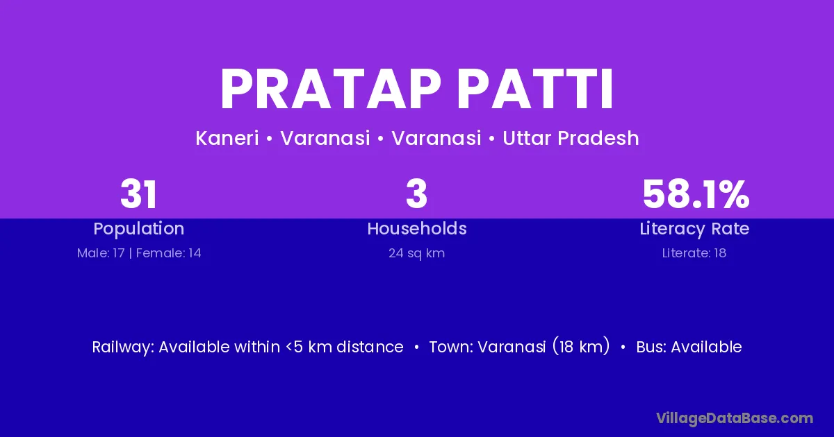 Varanasi (6 km) is the nearest town to Pratap Patti village for major economic activities and is located approximately 6 km away.