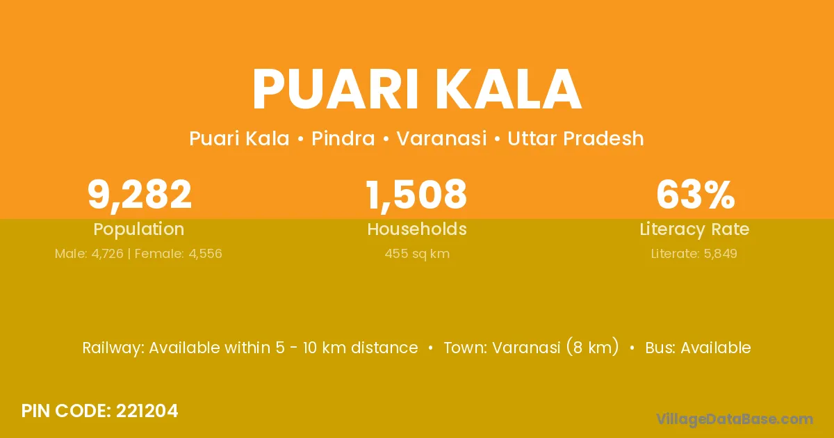 Varanasi (8 km) is the nearest town to Puari Kala village for major economic activities and is located approximately 8 km away.