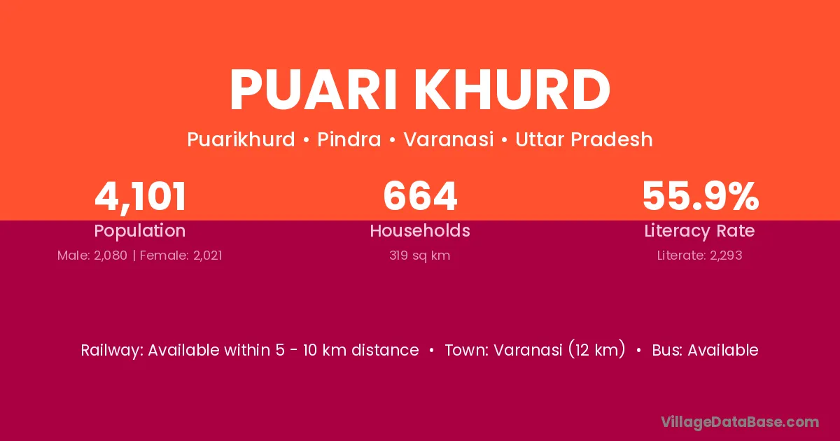 Varanasi (12 km) is the nearest town to Puari Khurd village for major economic activities and is located approximately 12 km away.