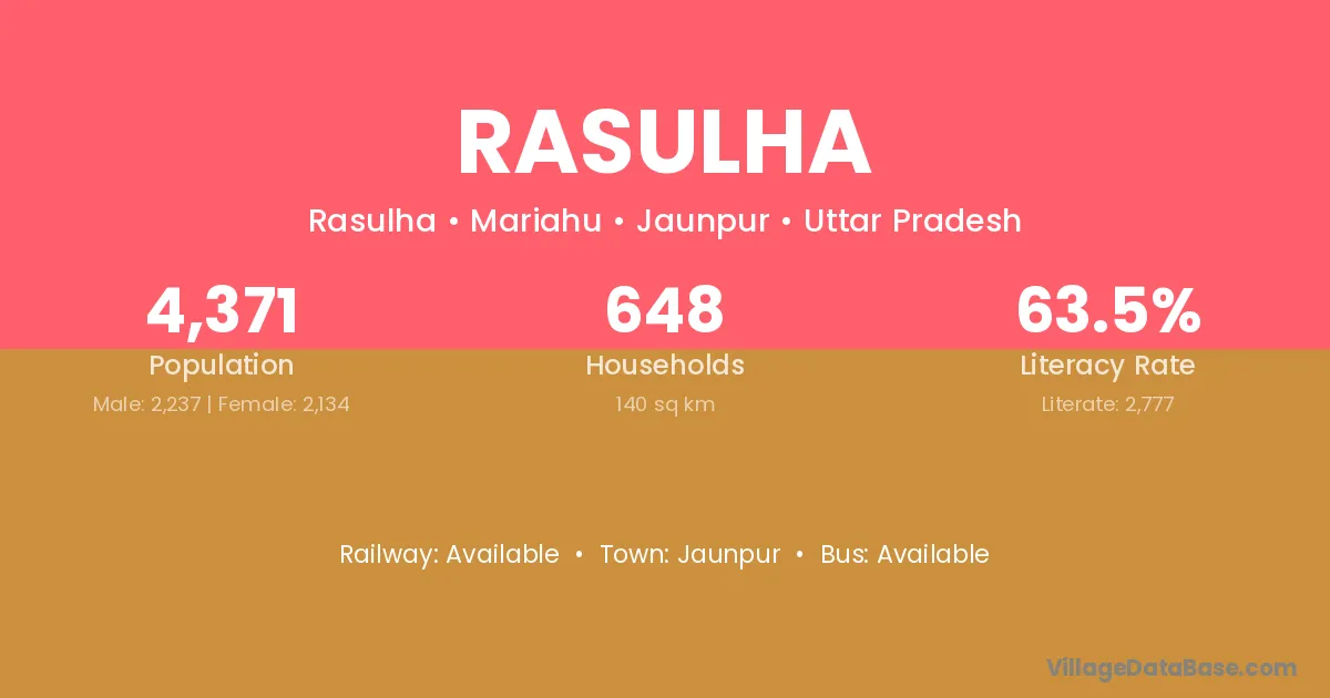 Rasulha village has a total population of 2,661 people, of which 1,354 are males and 1,307 are females.