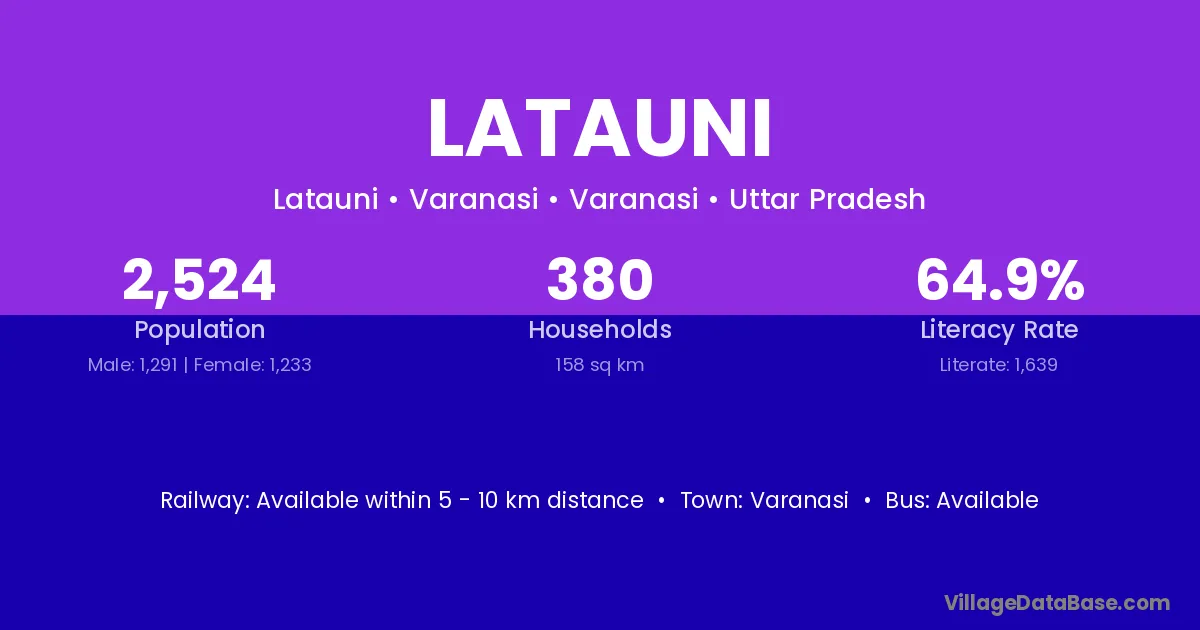 Latauni village has a total population of 2,524 people, of which 1,291 are males and 1,233 are females.