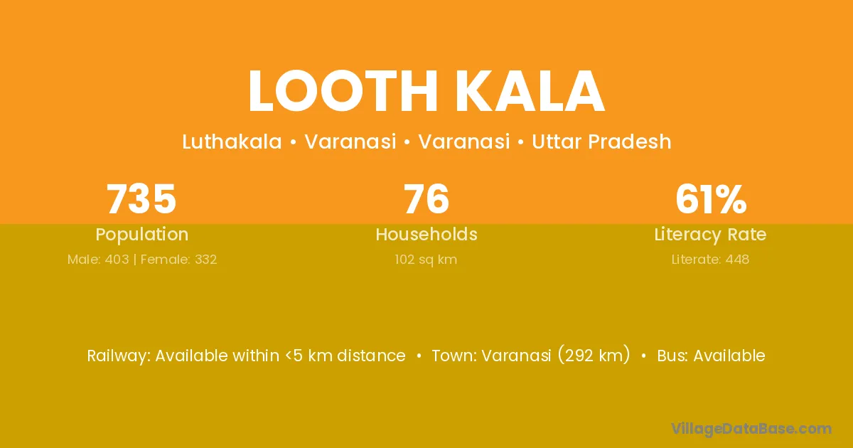 Varanasi (292 km) is the nearest town to Looth Kala village for major economic activities and is located approximately 292 km away.