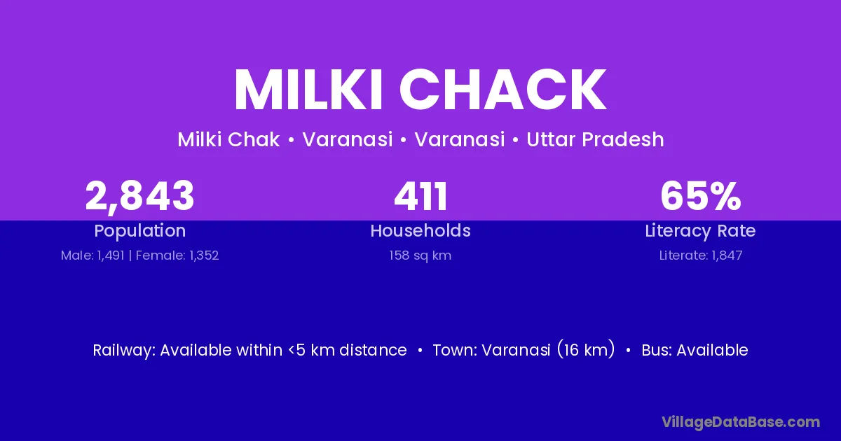 Varanasi (16 km) is the nearest town to Milki Chack village for major economic activities and is located approximately 16 km away.