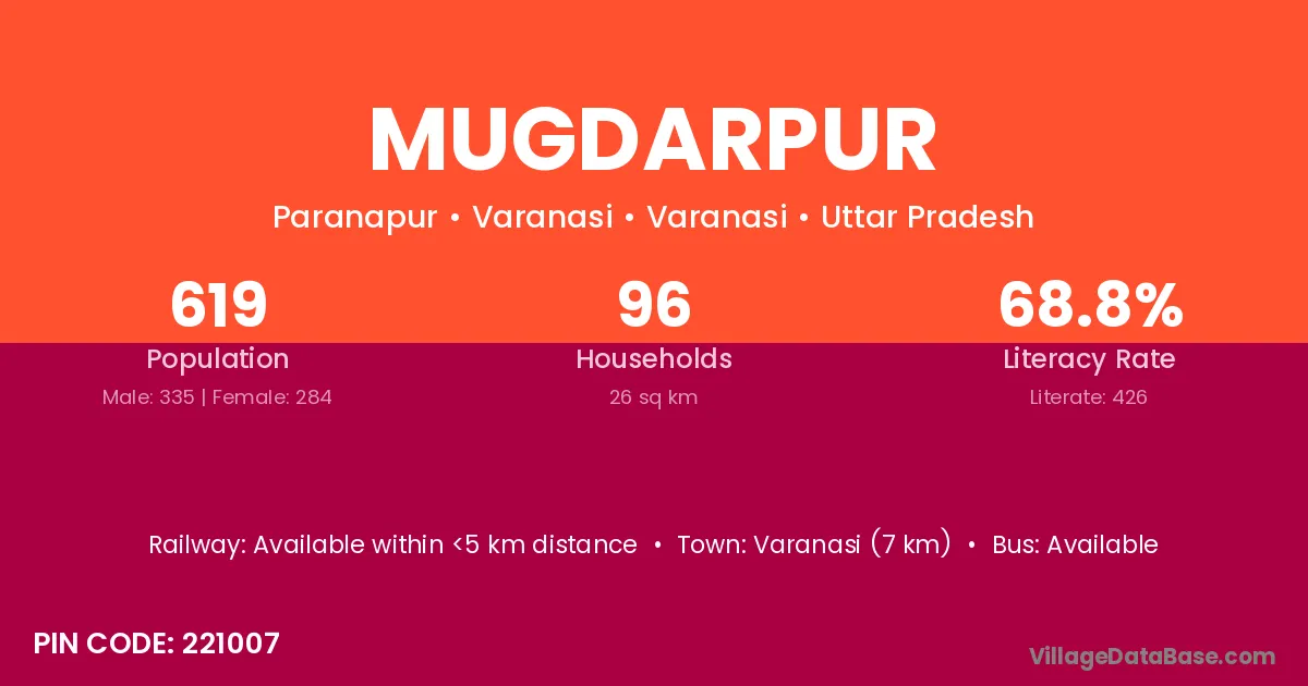 Varanasi (7 km) is the nearest town to Mugdarpur village for major economic activities and is located approximately 7 km away.