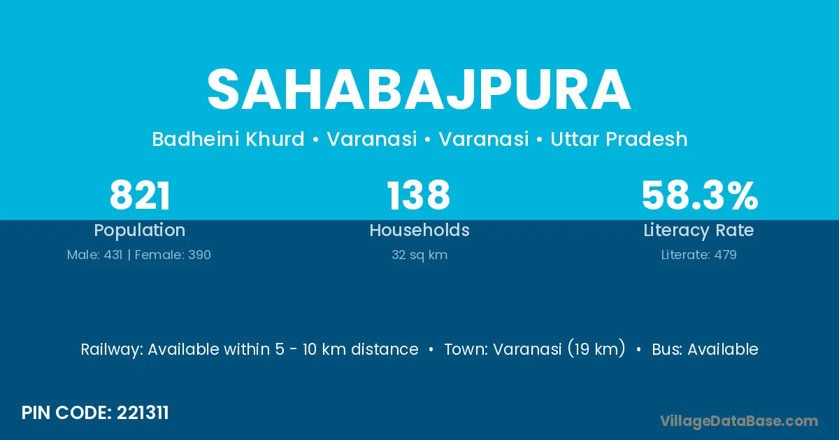 Varanasi (19 km) is the nearest town to Sahabajpura village for major economic activities and is located approximately 19 km away.