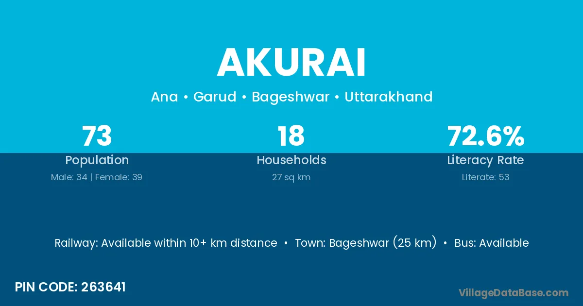 Bageshwar (25 km) is the nearest town to Akurai village for major economic activities and is located approximately 25 km away.