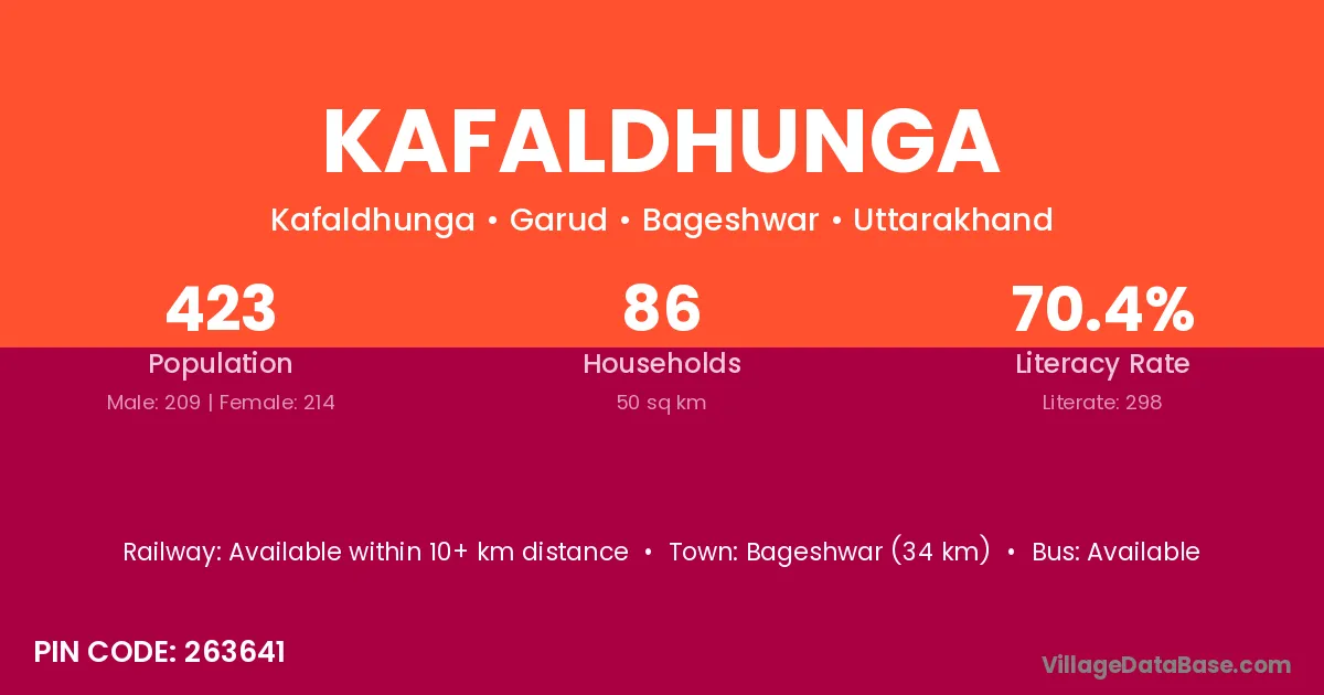 Bageshwar (34 km) is the nearest town to Kafaldhunga village for major economic activities and is located approximately 34 km away.