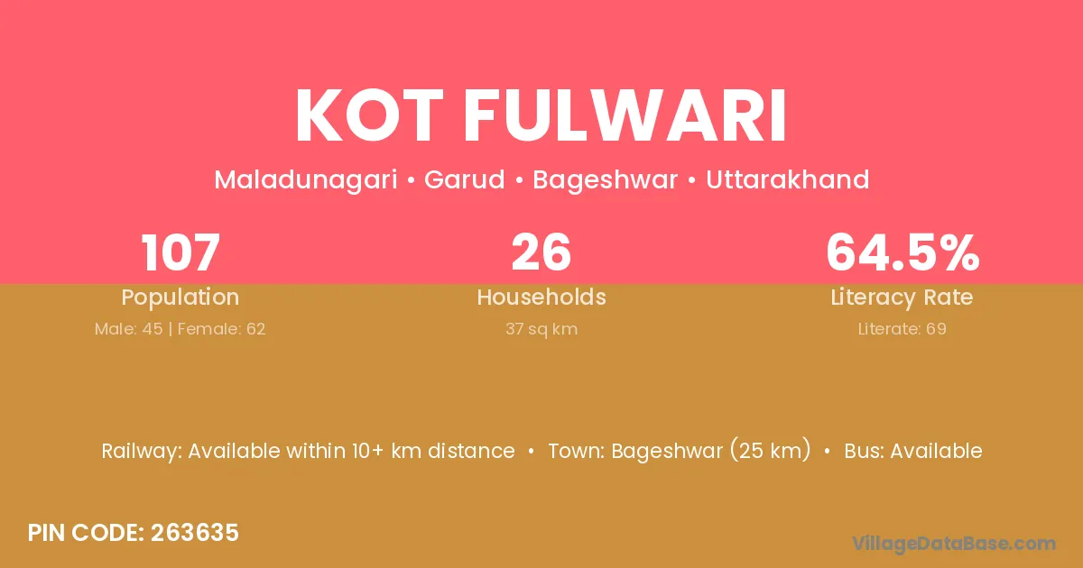 Bageshwar (25 km) is the nearest town to Kot Fulwari village for major economic activities and is located approximately 25 km away.