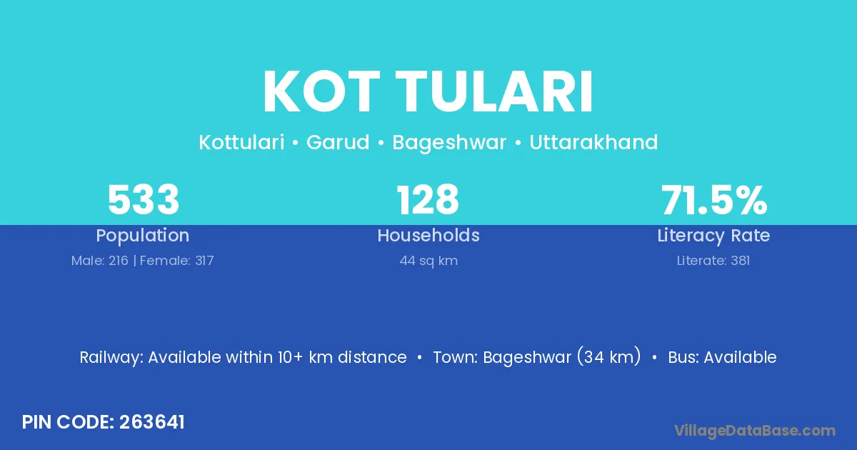 Bageshwar (34 km) is the nearest town to Kot Tulari village for major economic activities and is located approximately 34 km away.