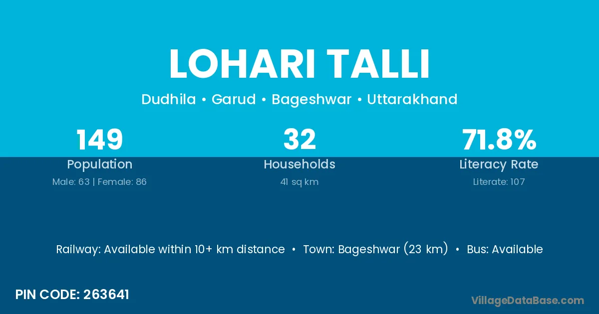 Bageshwar (23 km) is the nearest town to Lohari Talli village for major economic activities and is located approximately 23 km away.
