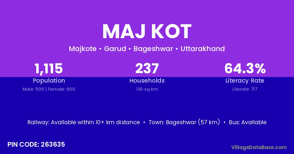 Bageshwar (57 km) is the nearest town to Maj Kot village for major economic activities and is located approximately 57 km away.