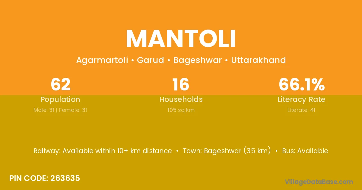 Bageshwar (35 km) is the nearest town to Mantoli village for major economic activities and is located approximately 35 km away.