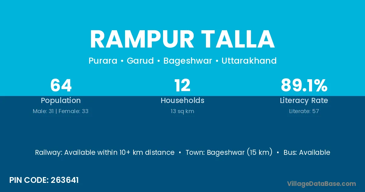 Bageshwar (15 km) is the nearest town to Rampur Talla village for major economic activities and is located approximately 15 km away.