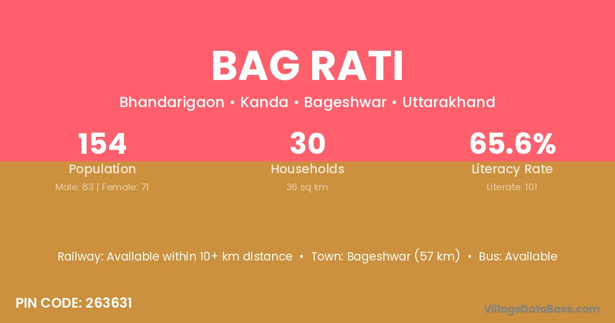 Bageshwar (57 km) is the nearest town to Bag Rati village for major economic activities and is located approximately 57 km away.