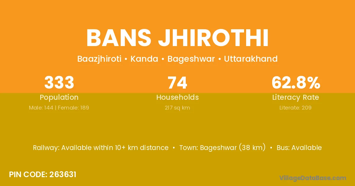 Bageshwar (38 km) is the nearest town to Bans Jhirothi village for major economic activities and is located approximately 38 km away.