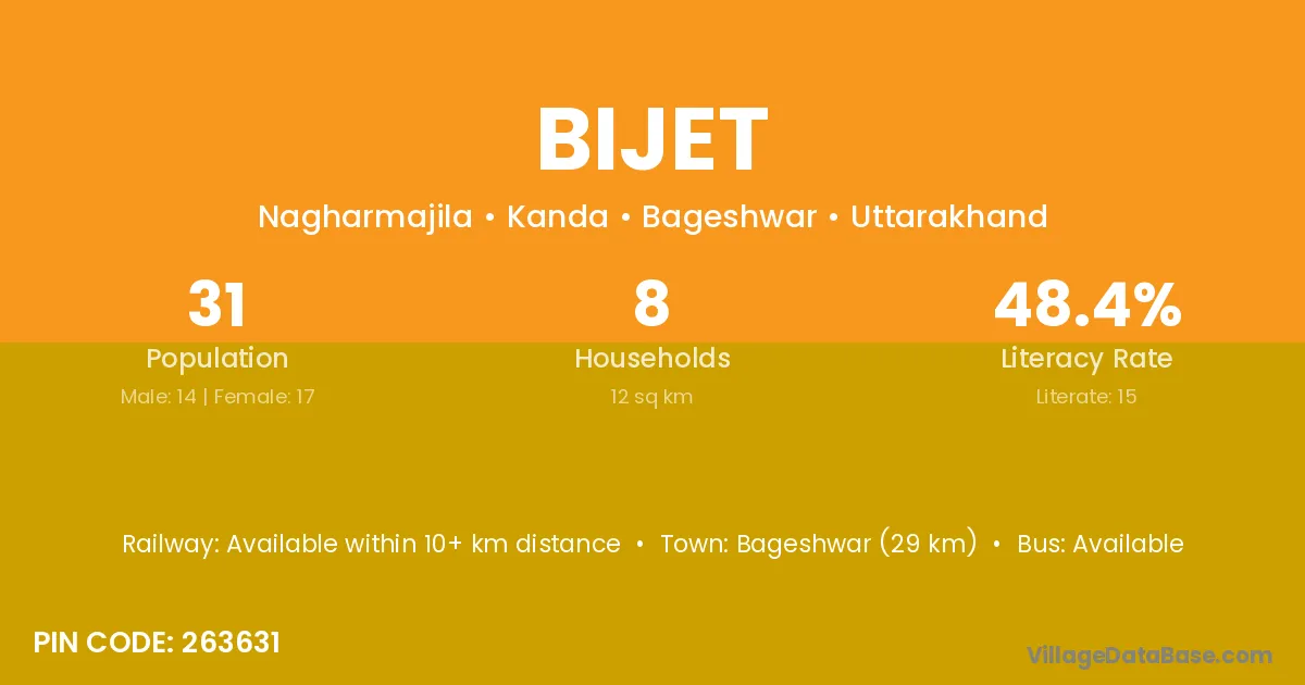 Bageshwar (29 km) is the nearest town to Bijet village for major economic activities and is located approximately 29 km away.