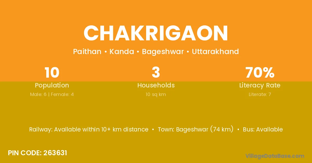 Bageshwar (74 km) is the nearest town to Chakrigaon village for major economic activities and is located approximately 74 km away.
