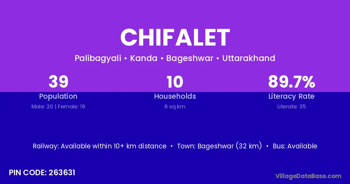 Bageshwar (32 km) is the nearest town to Chifalet village for major economic activities and is located approximately 32 km away.