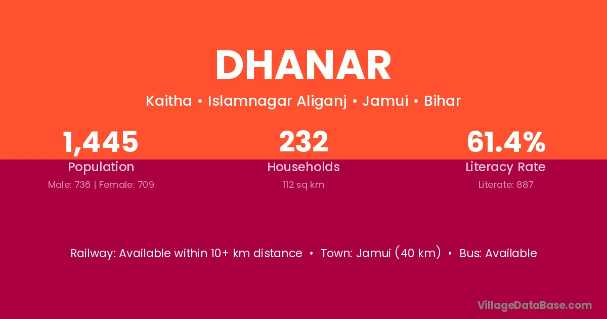 Dhanar village has a total population of 68 people, of which 35 are males and 33 are females.