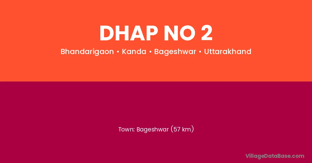 Bageshwar (57 km) is the nearest town to Dhap No 2 village for major economic activities and is located approximately 57 km away.